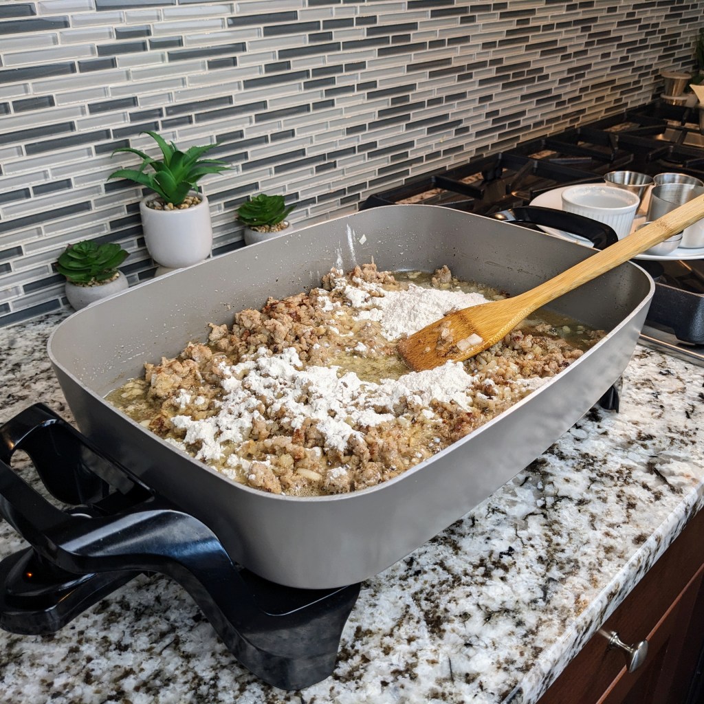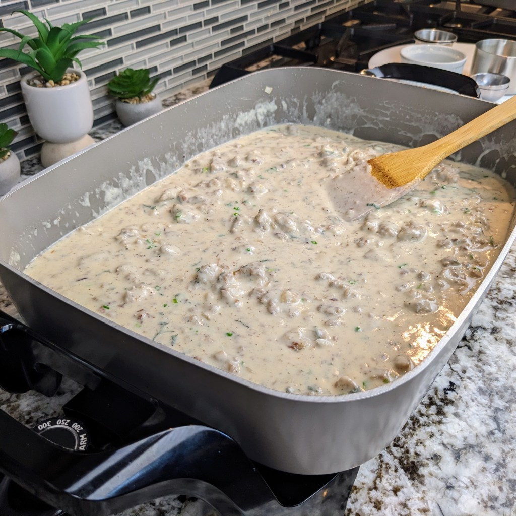 We love sleeping in on the weekends, then enjoying a hearty brunch. One favorite is biscuits and sausage gravy, fruit, and a salad. Sausage gravy is a traditional Southern breakfast dish in the U.S.