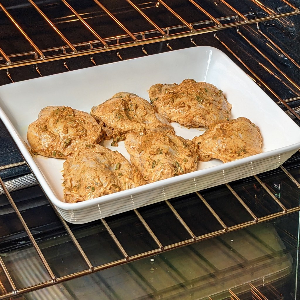 Place marinaded chicken in a prepared baking dish, make sure to scrape out all the extra marinade and place over the chicken. Then place it in the preheated oven.
