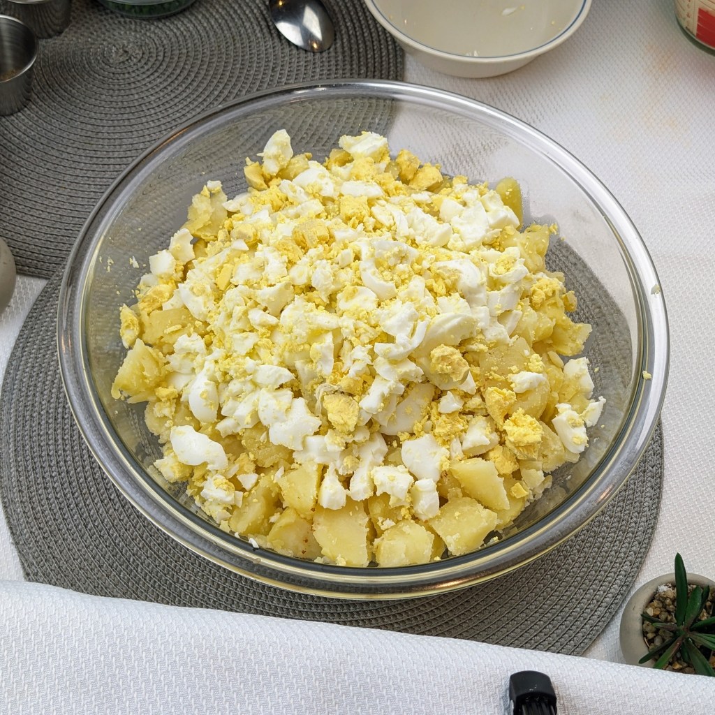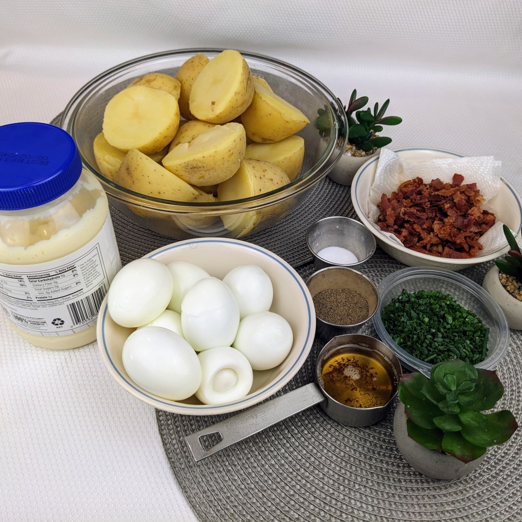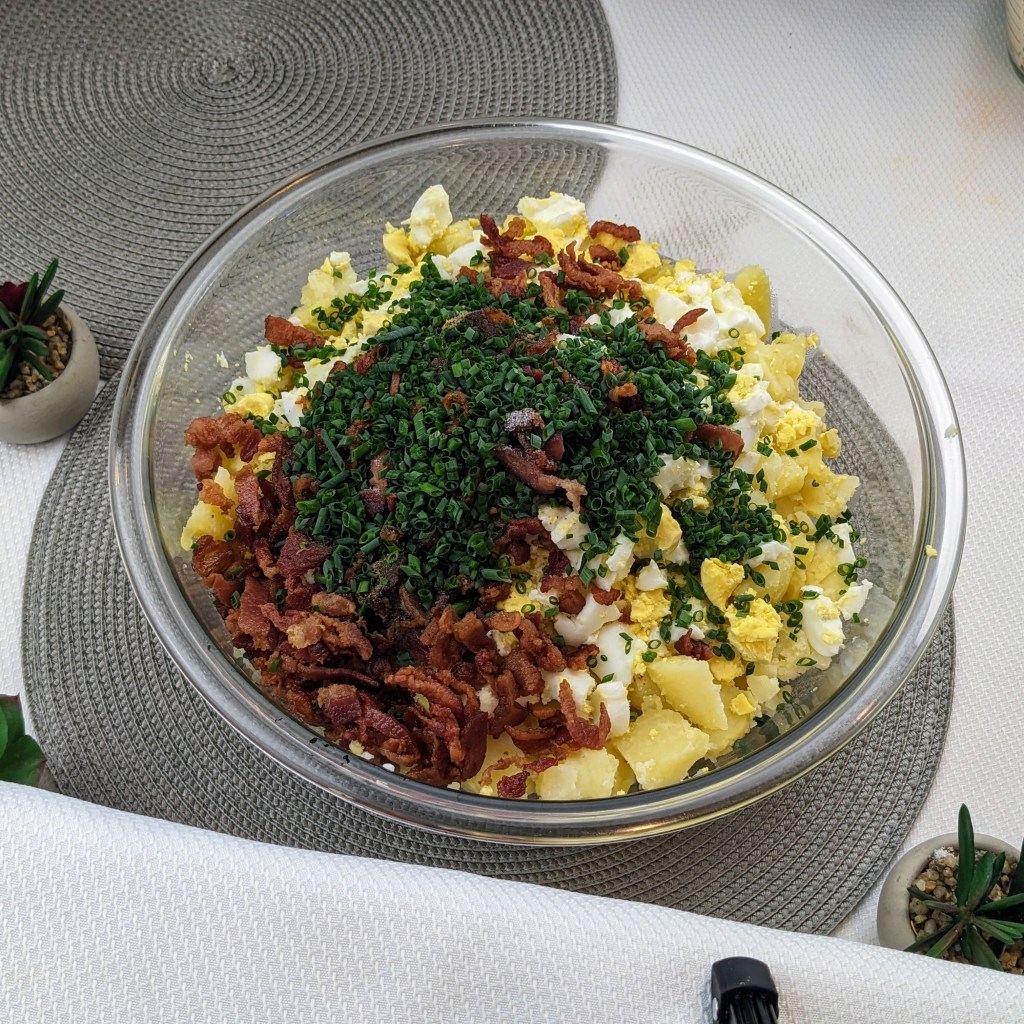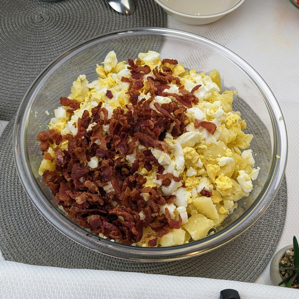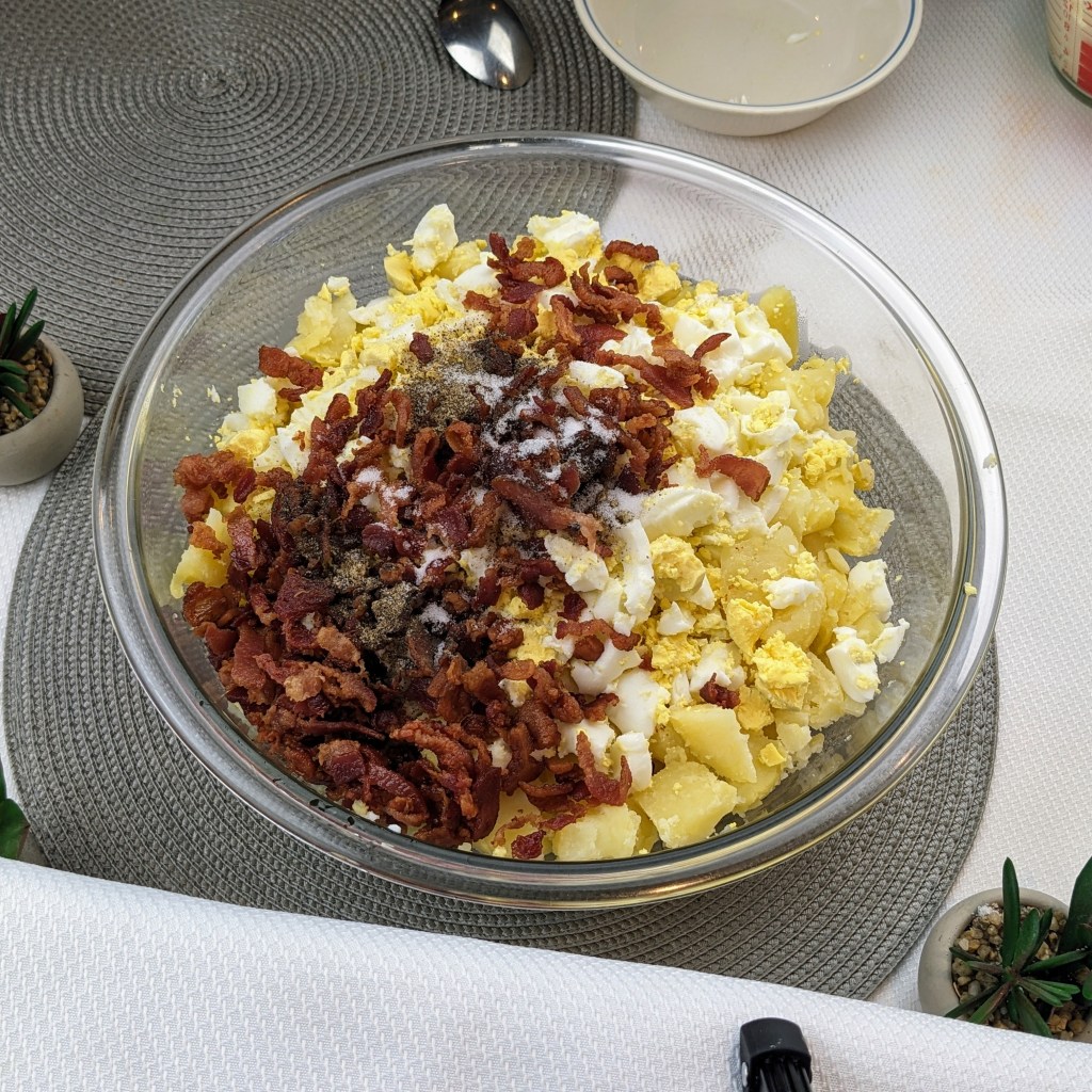 Today I will be sharing my potato salad with bacon recipe. This one is one of my favorites. The ingredients are pretty straight-forward; it’s just bacon, potato, eggs, and a few other things.