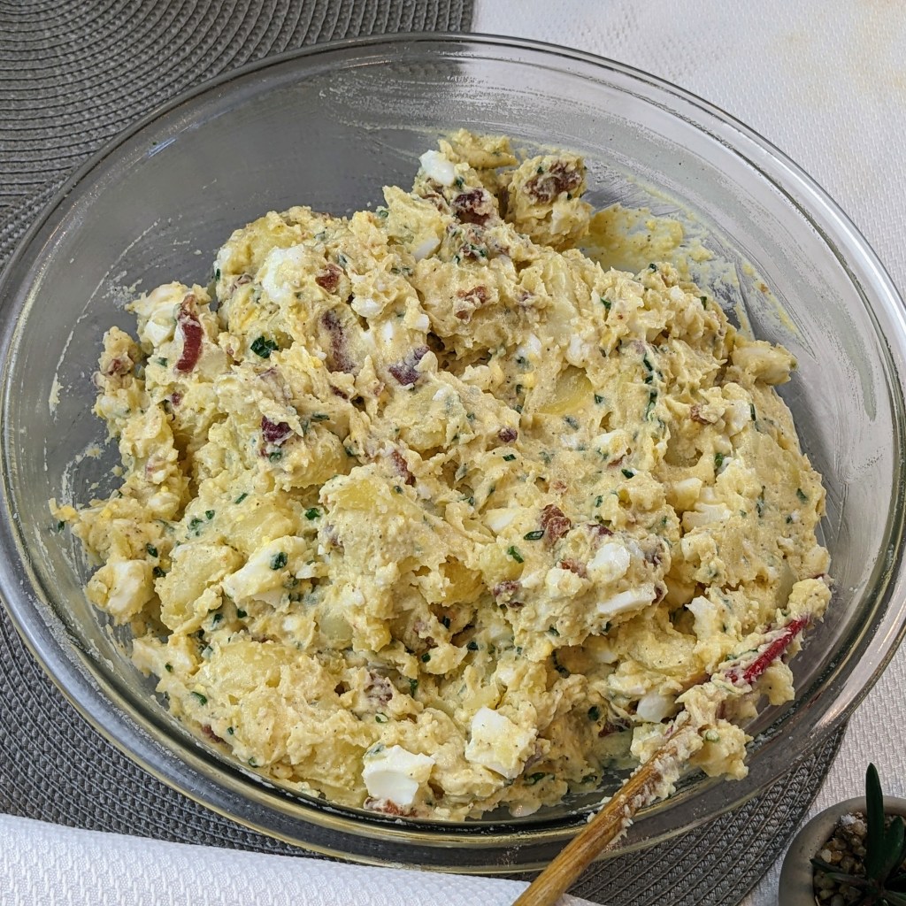 The secret to this delicious potato salad is the addition of bacon fat. Just a few tablespoons of this fatty goodness adds tremendous amount of flavor. Make sure to use full fat mayo as well.