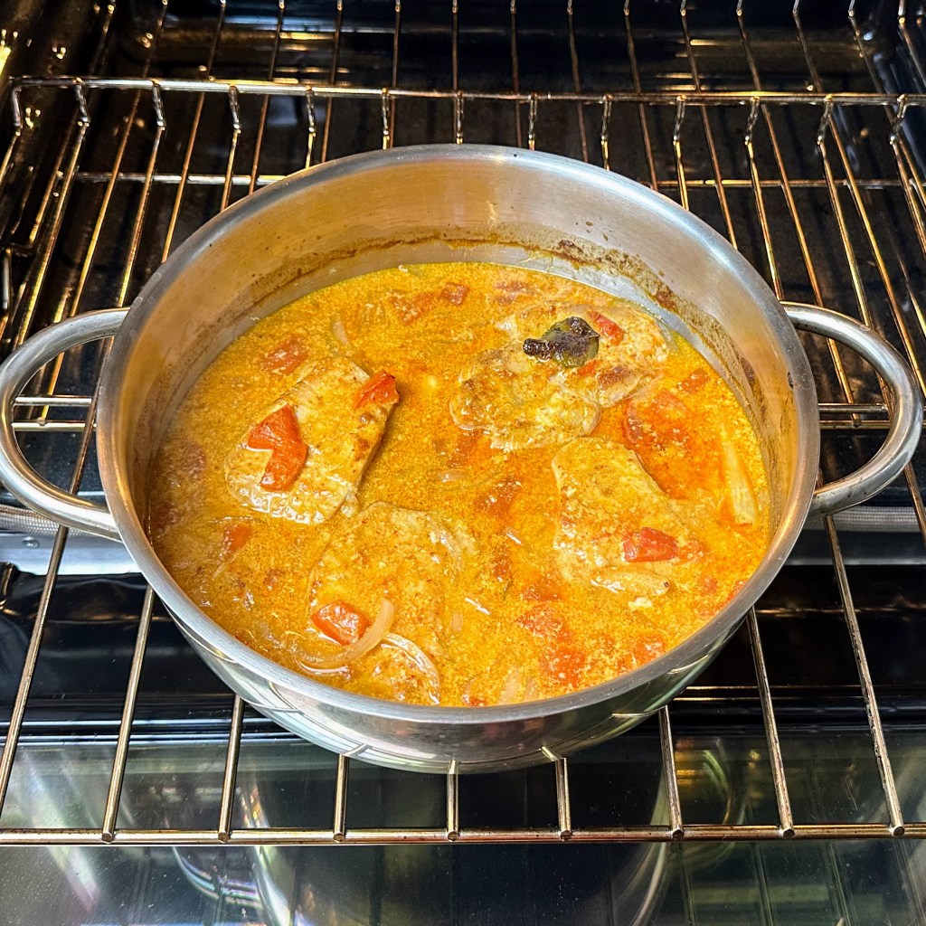Pour the curry sauce all over the pork. Then cover the pan and transfer it to preheated oven.