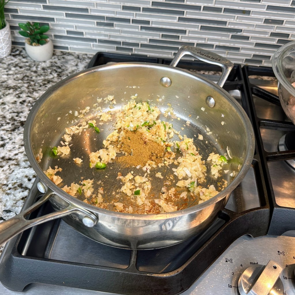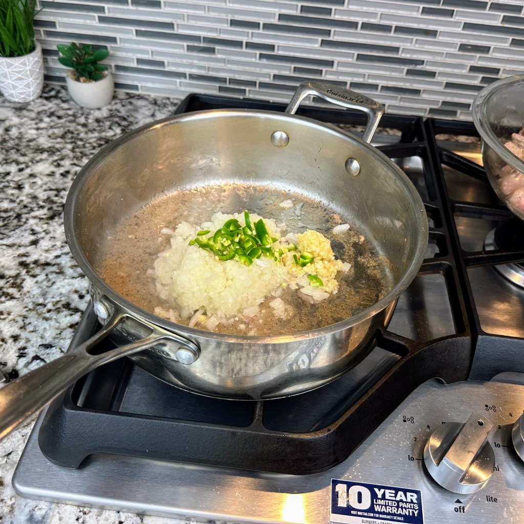 Make sure you have at least 1 tbsp fat in the pan, and add onion, garlic, and jalapeno in the same skillet. Turn the heat down to medium, then cook for 5 minutes, stirring occasionally until soft.