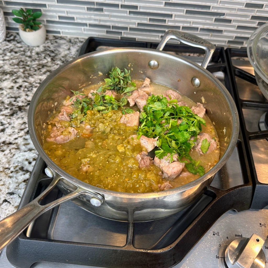 Add pork cubes along with any juices might accumulate in the bowl, oregano, cilantro, Verde sauce, and water.