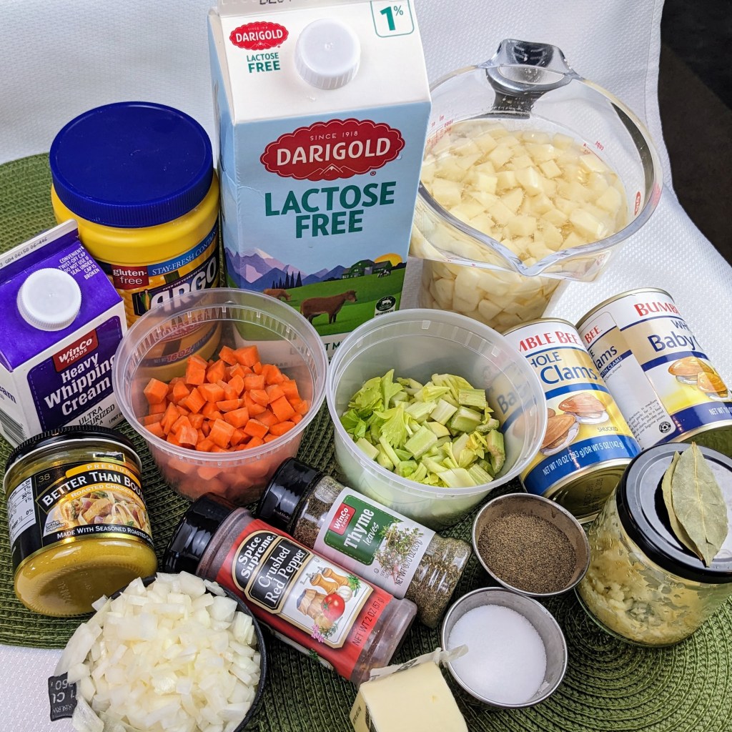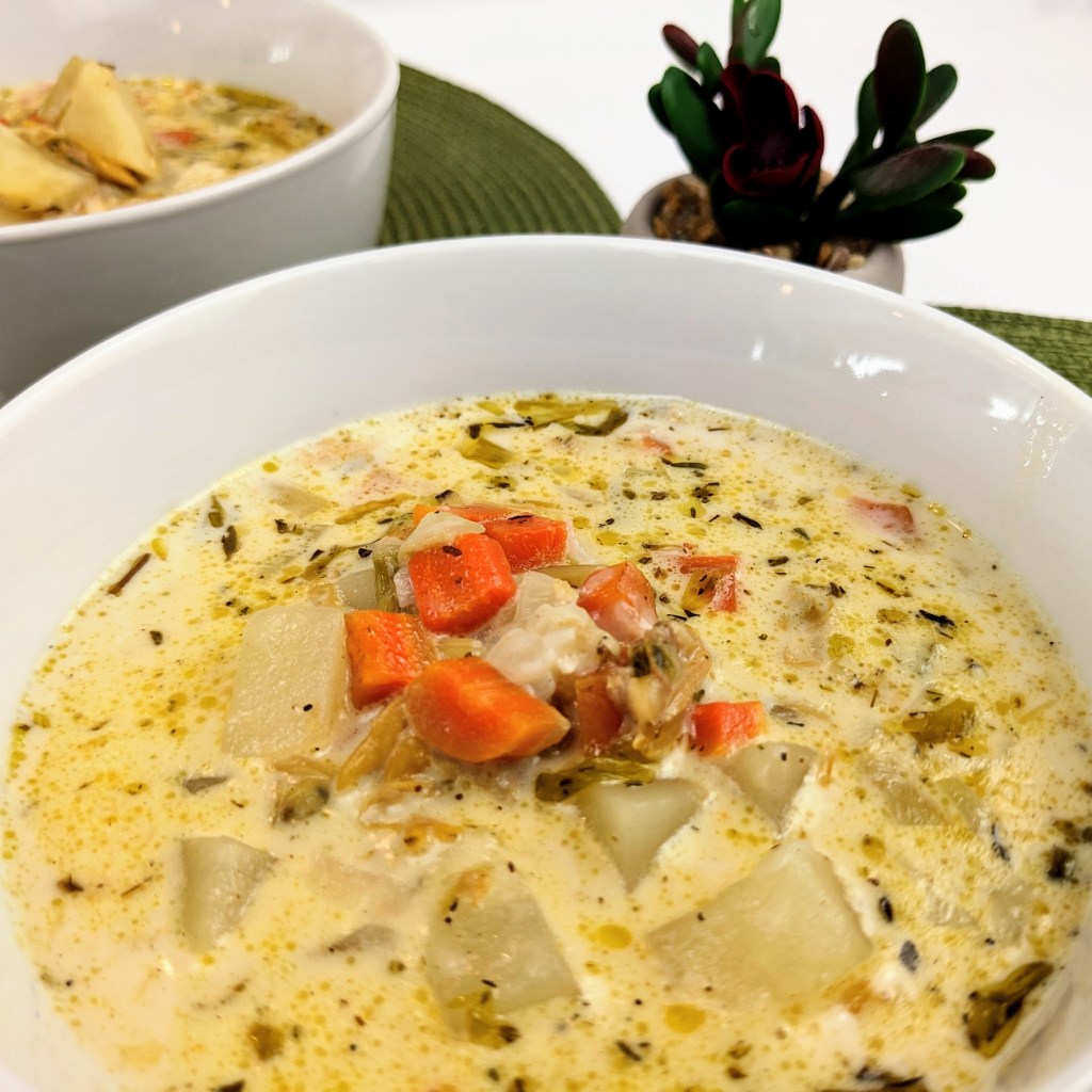 Today I will share my home-style clam chowder recipe. This one is cream-based and has all the traditional chowder ingredients like onion, carrots, celery, potatoes and canned clams.
