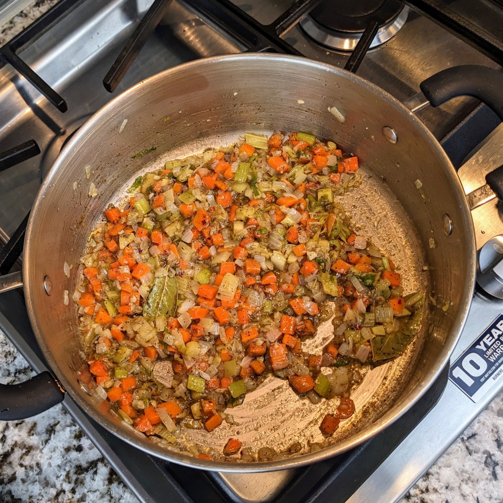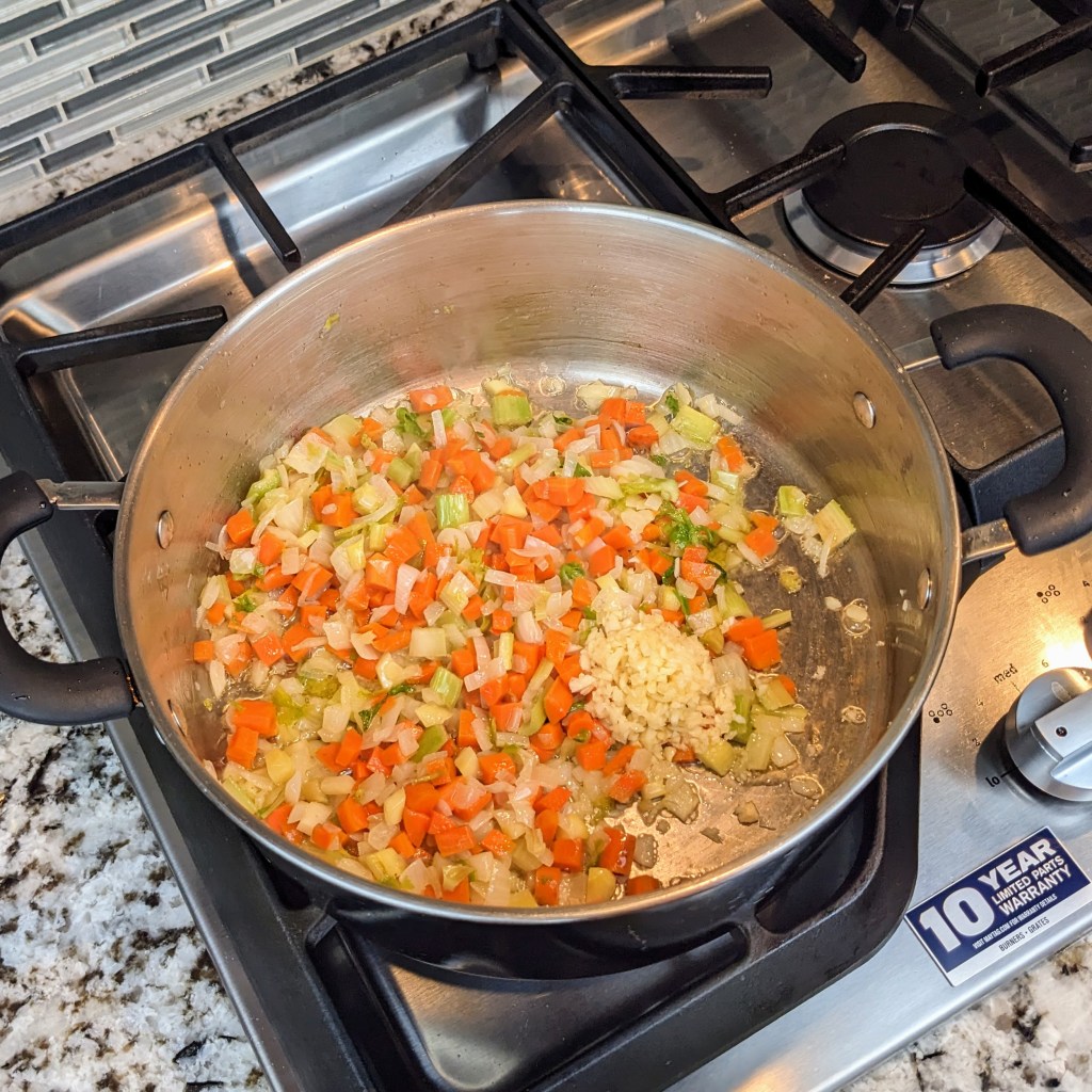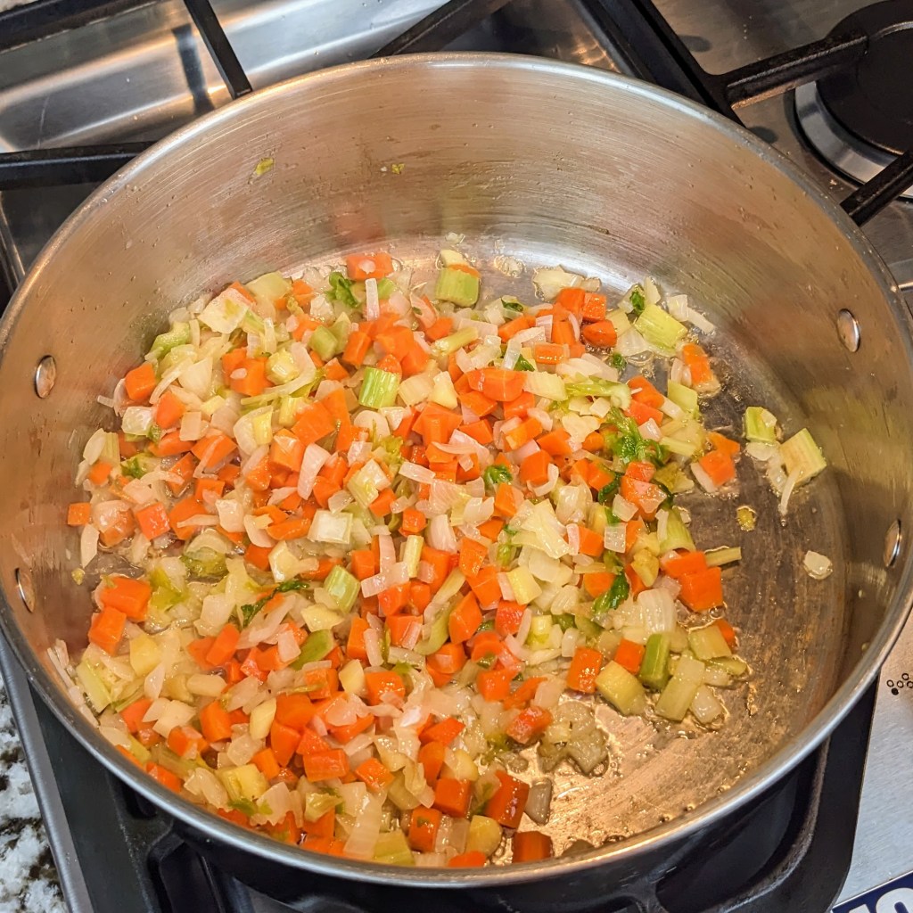 Heat a large soup pot over medium heat. Add butter, once the butter is melted add onion, celery, and carrots. Stir well, cook for 3-5 minutes.