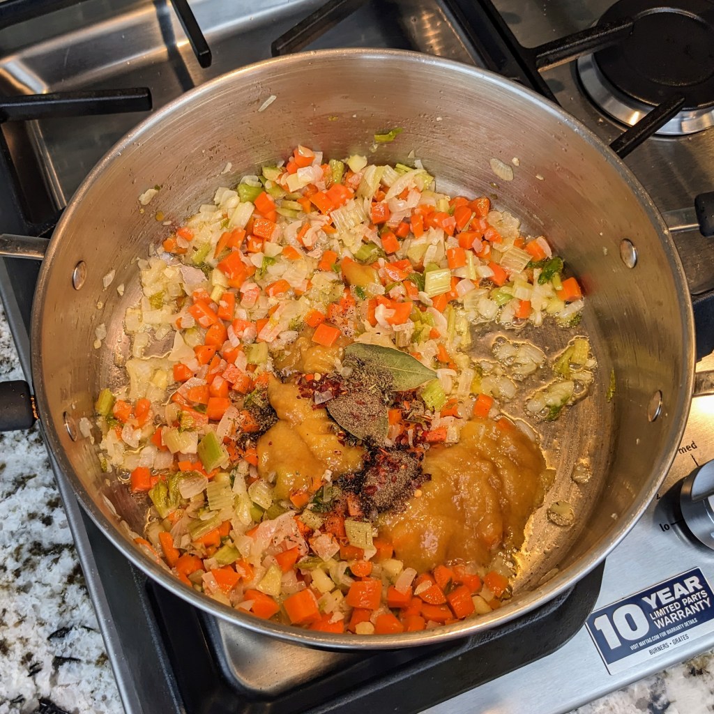 Add bay leaves, thyme, chili flakes, salt, pepper, and chicken base. Turned the heat down to low. Stir well, then cook for 1 minutes.