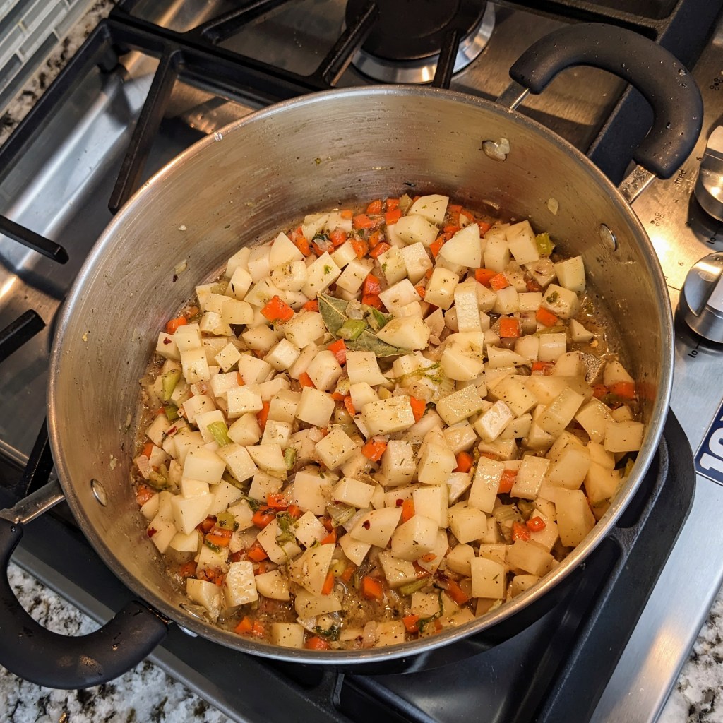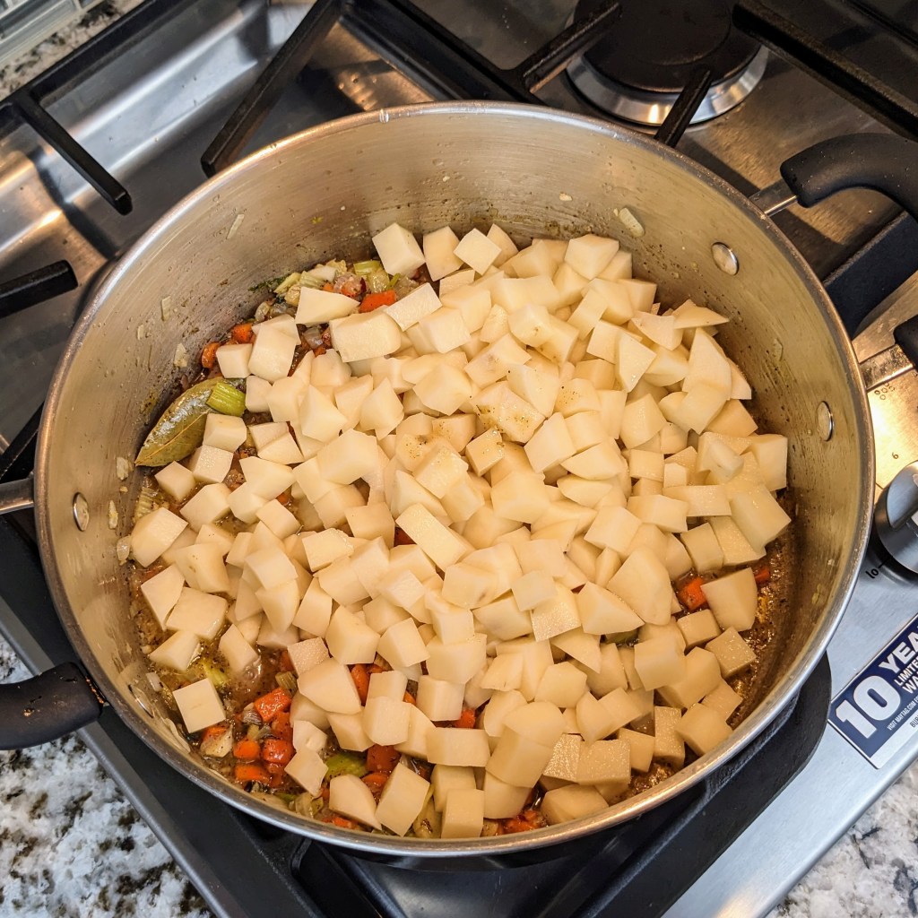 Bring to a gentle boil, cover, and simmer until the potatoes are tender for about 25 minutes.