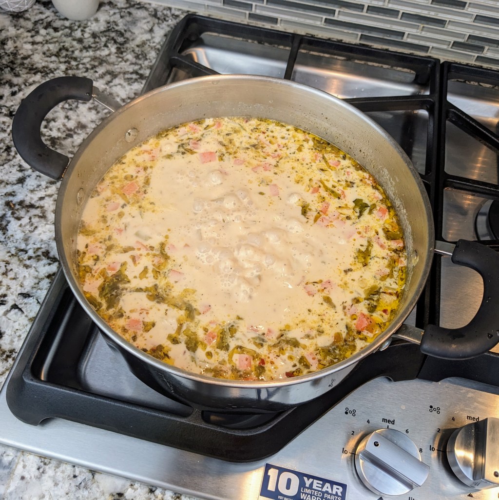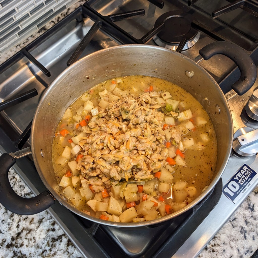 Then, add the canned clams along with it’s juices, half & half, and milk.