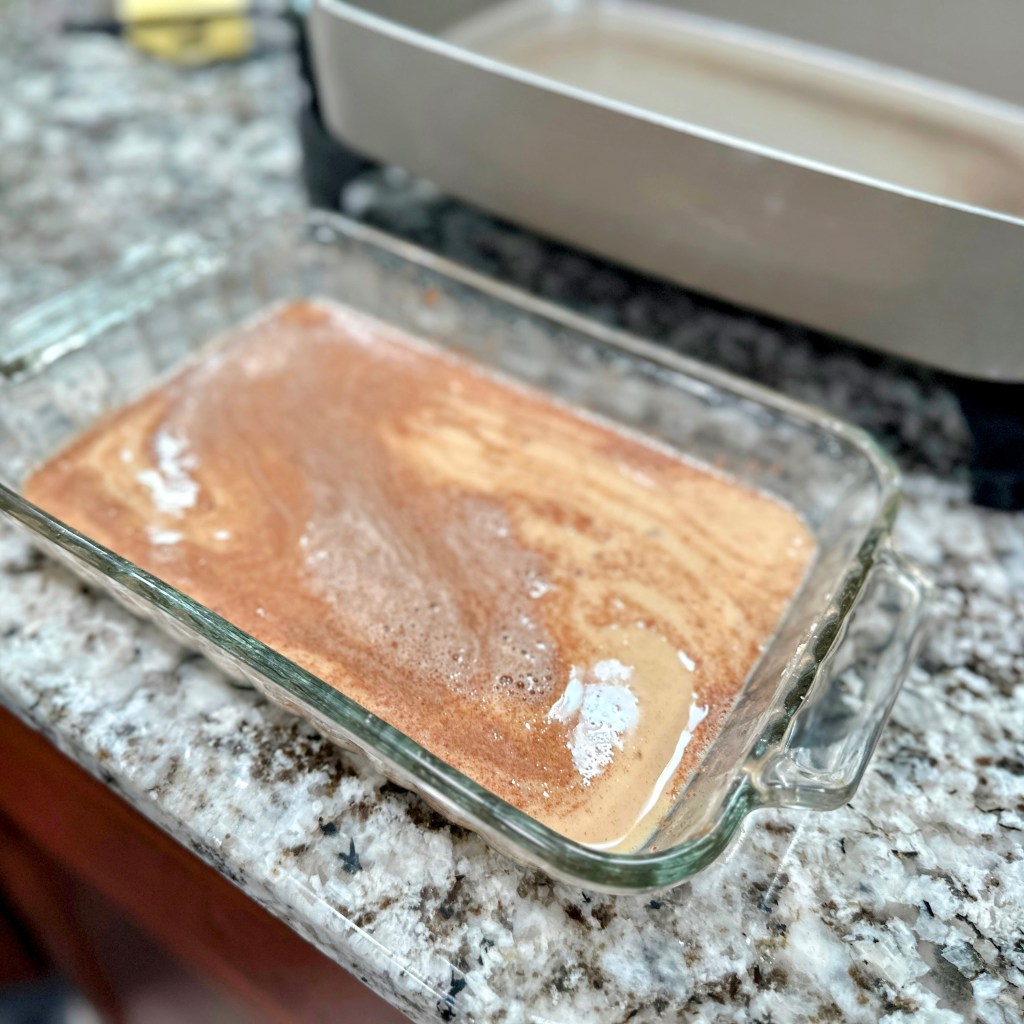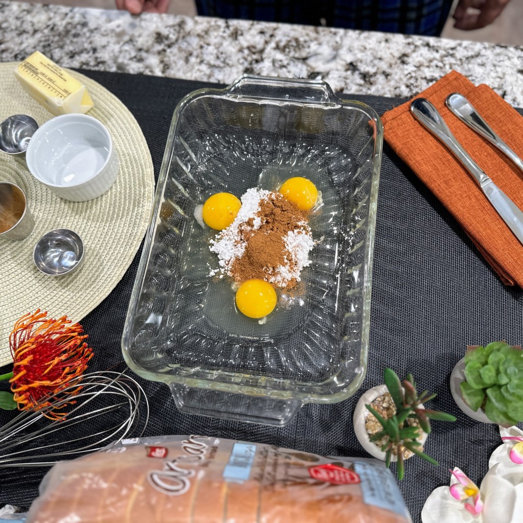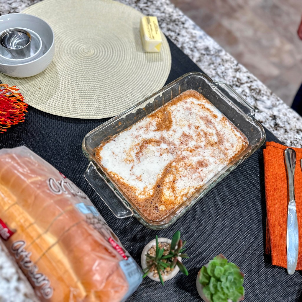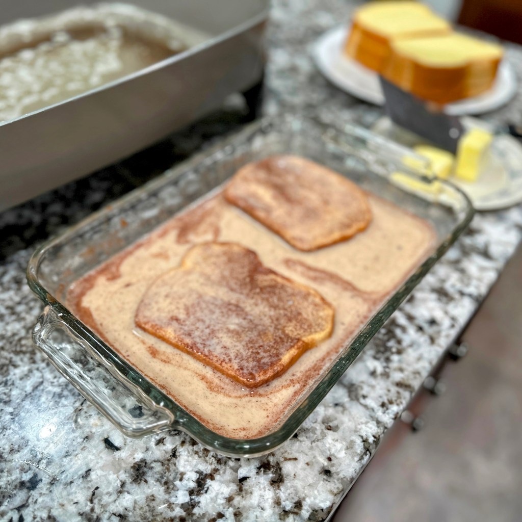 In a large rectangle dish add eggs, vanilla, salt, powdered sugar, and cinnamon. Whisk until cinnamon is incorporated well. Add milk, then mix well.