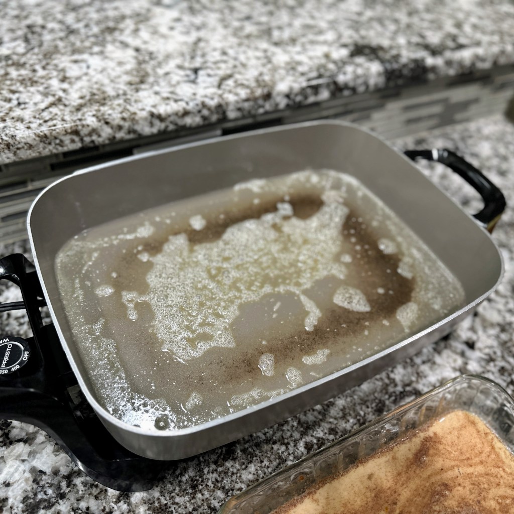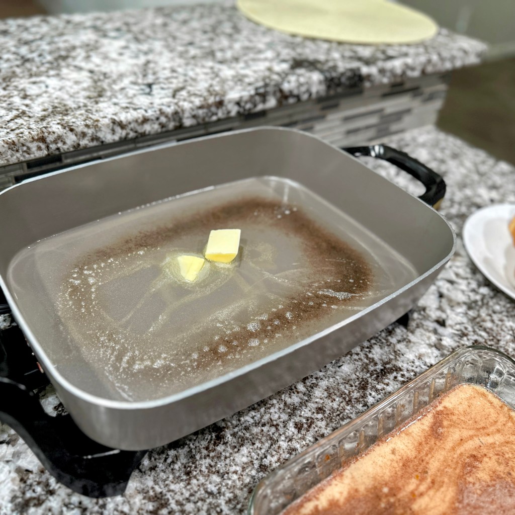 Heat a large non-stick electric griddle or skillet over medium-heat. Add butter, once the butter is melted, dip bread slices into the batter, make sure to dredge them well on both sides, then place on hot buttered griddle or skillet.