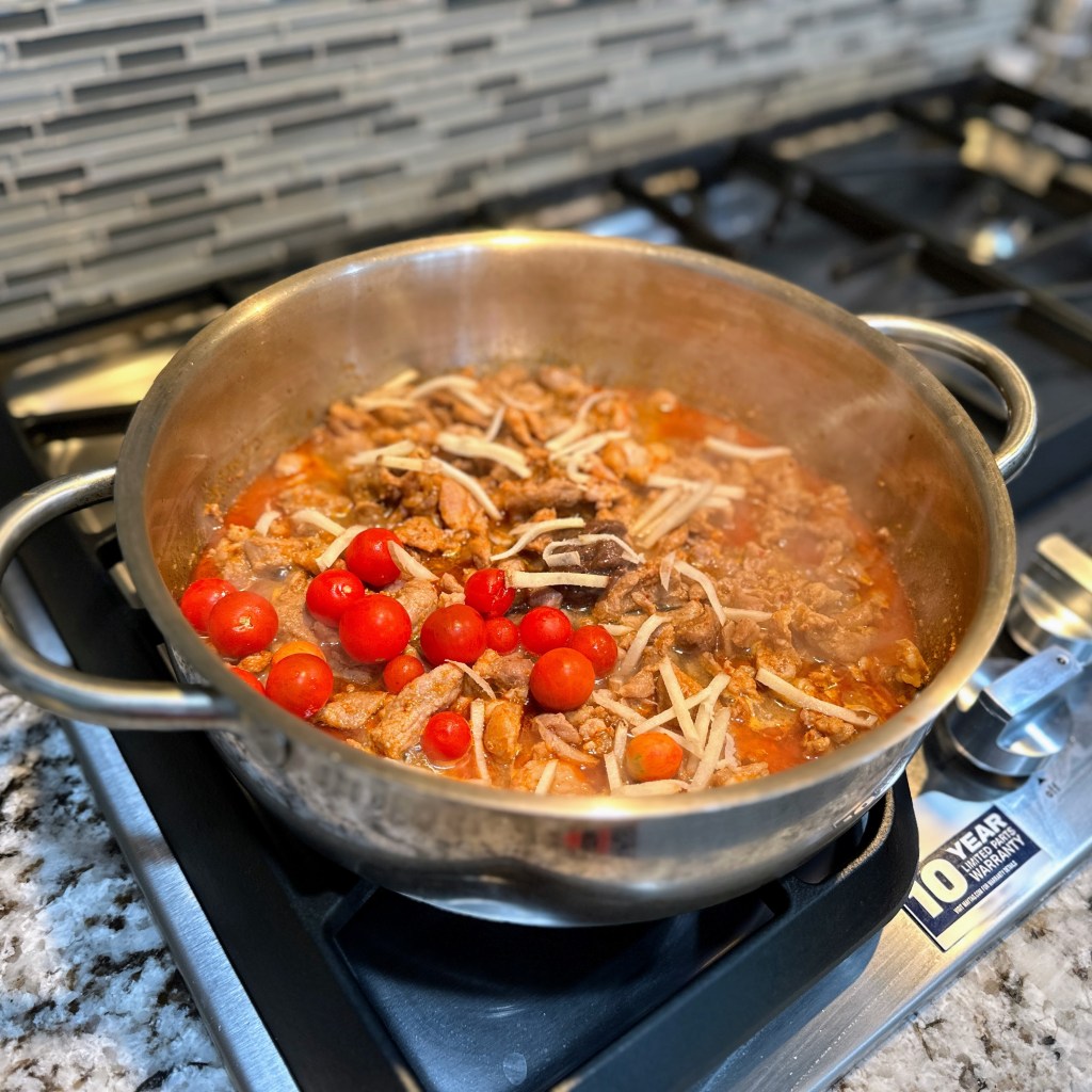 Heat a heavy bottom sauce pan over medium-high heat. Once the oil is hot add the marinated pork. Cook for 7-10 minutes stirring often.