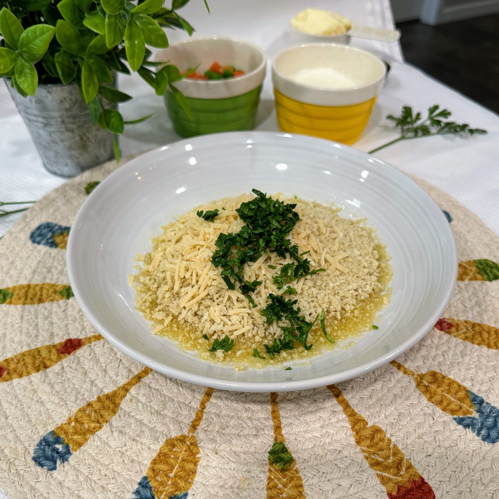Add the panko bread crumbs, parmesan cheese, and parsley to the melted butter. Mix well.