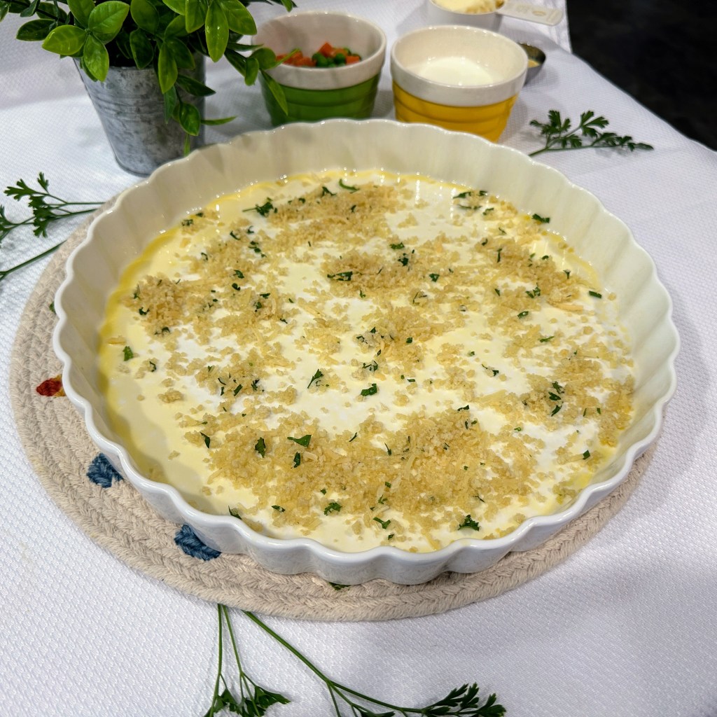 Then, sprinkle half a cup of panko mixture over the bottom of the greased baking dish.