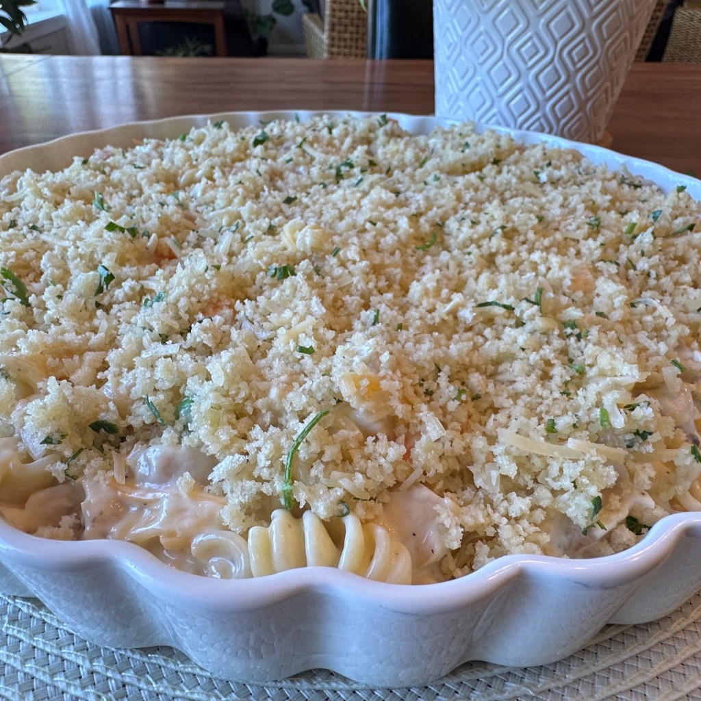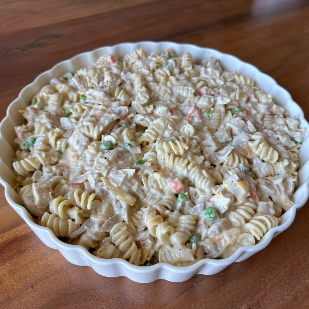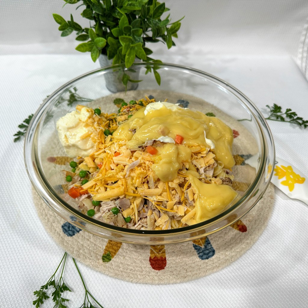 Drain the pasta and place it in a large mixing bowl, adding rest of the casserole ingredient to the pasta. Mix well, then set it aside while you make the crunchy topping.