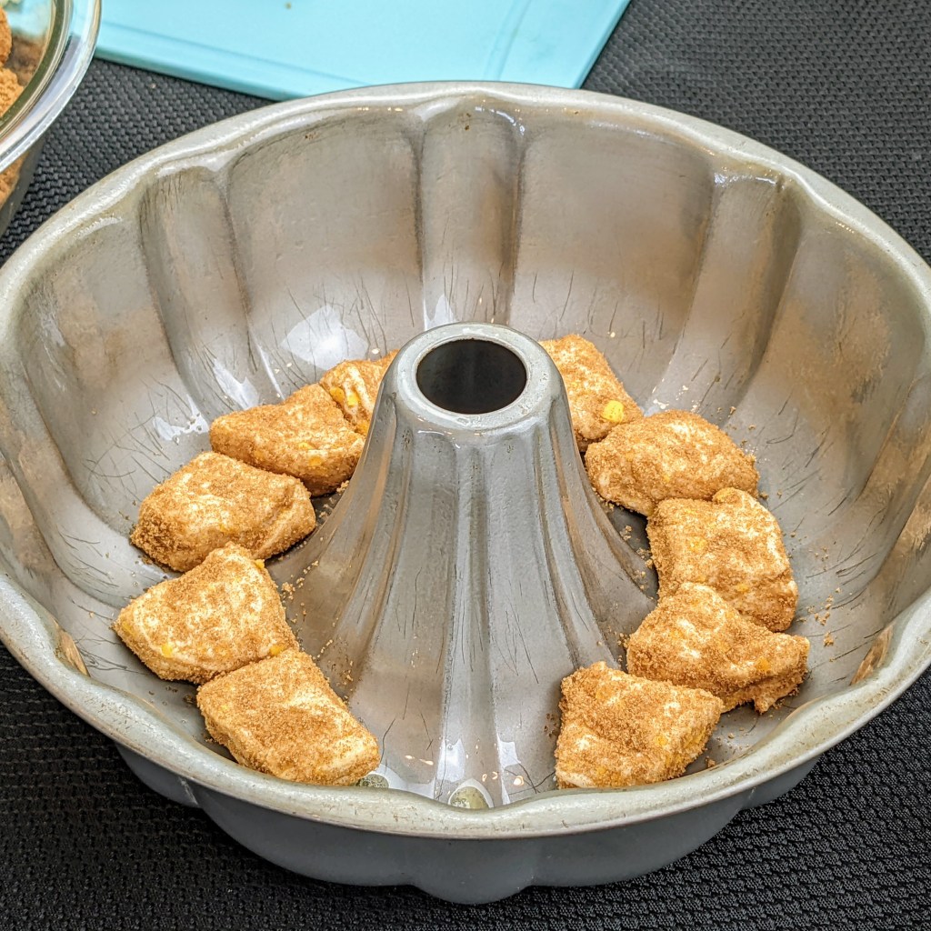 Cut each biscuits into four pieces. In a medium sized bowl, add one cup brown sugar and four teaspoon ground cinnamon. Mix well, then dip few pieces of biscuit at a time, start layering prepared pan. Once you are about halfway through stop.