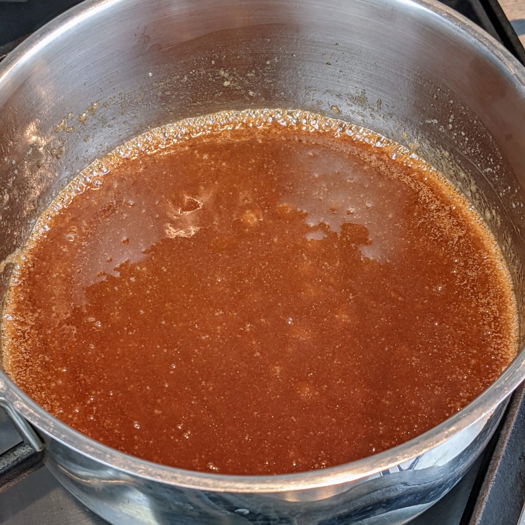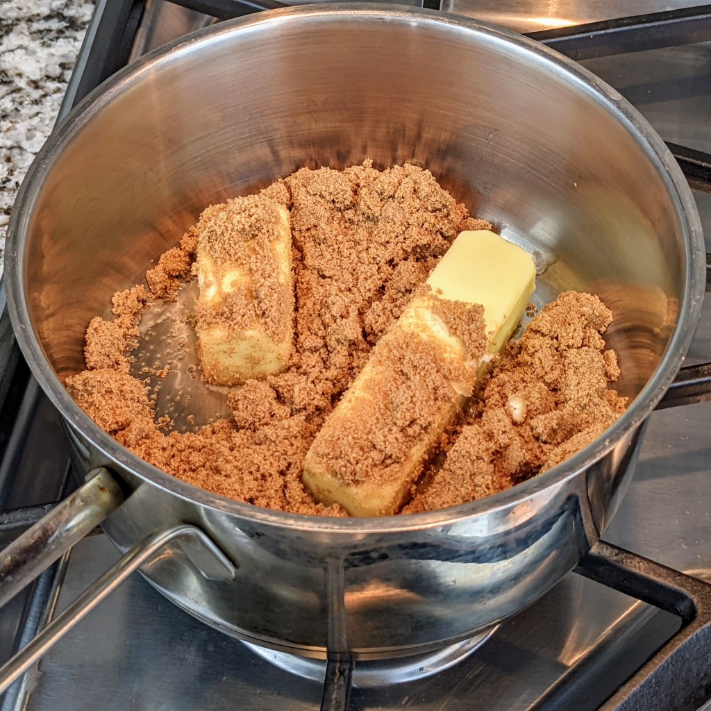 Place butter and the other cup of sugar in a medium sized heavy bottom sauce pan. Melt butter and sugar over medium heat until completely melted.