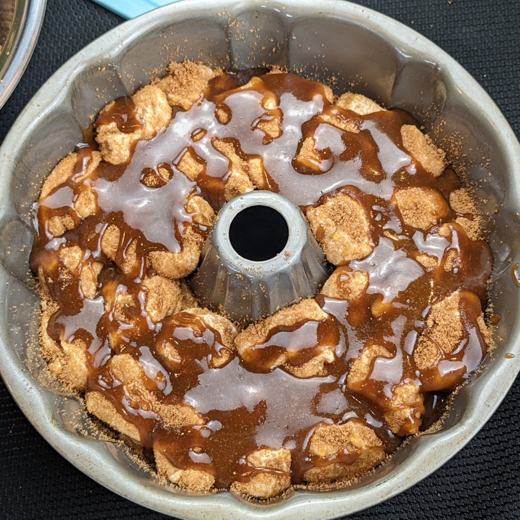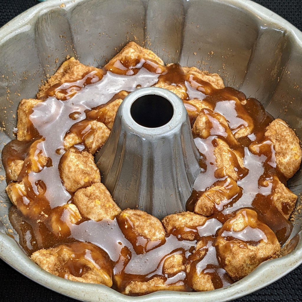Gently warm up the reserved sauce and drizzle over the top of the finished monkey bread and enjoy!